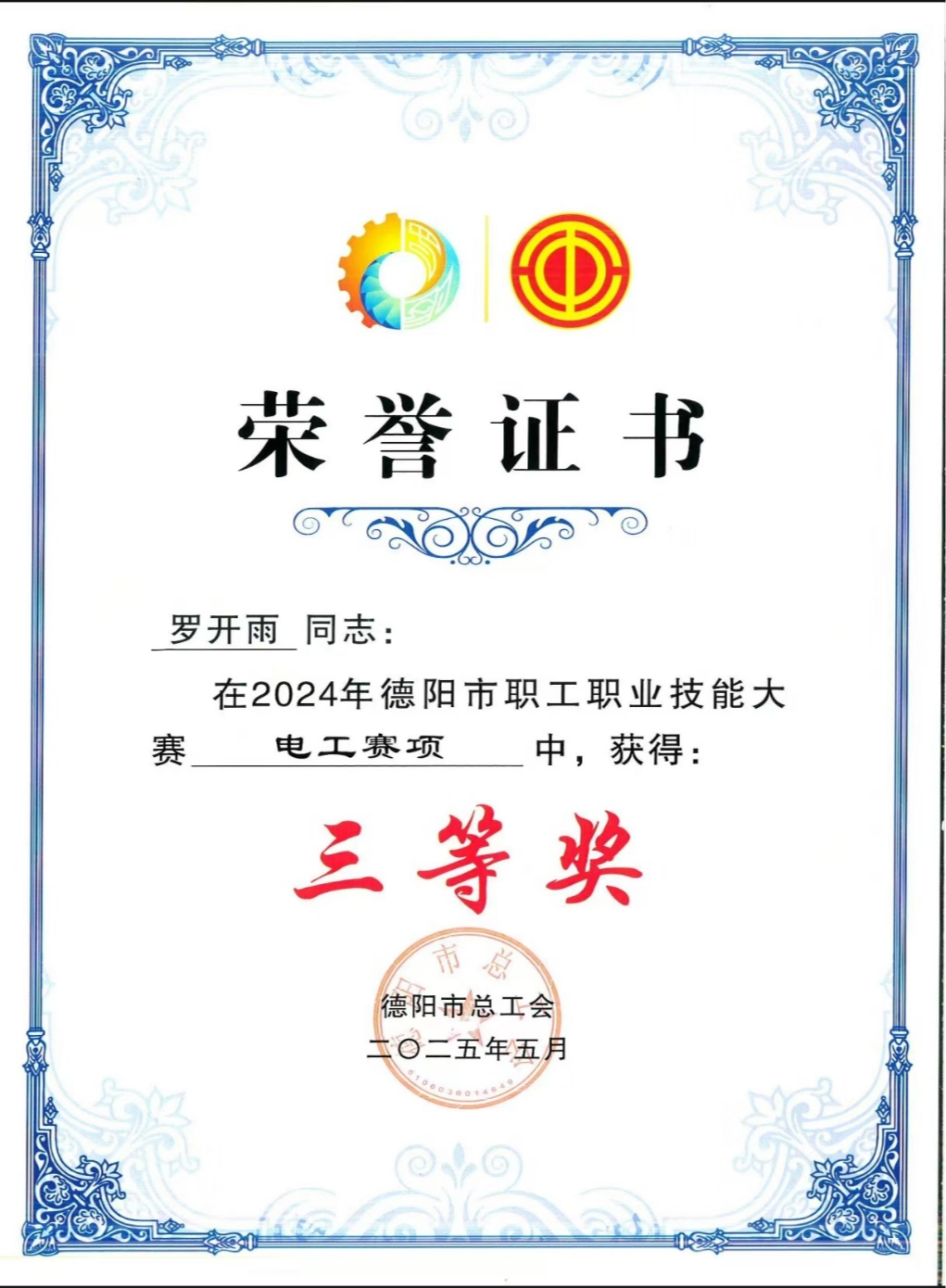 近日,2024年德陽市職工職業(yè)技能大賽電工賽項結果揭曉,公司員工羅開雨憑借出色表現(xiàn),取得第4名,榮獲該賽項三等獎 。此次賽事由德陽市總工會主辦,旨在提升職工職業(yè)技能水平,羅開雨在賽中展現(xiàn)專業(yè)實力,為個人及公司增添榮譽,彰顯了電工領域技能人才的風采,同時也激勵公司更多青年職工投身技能提升與職業(yè)發(fā)展。